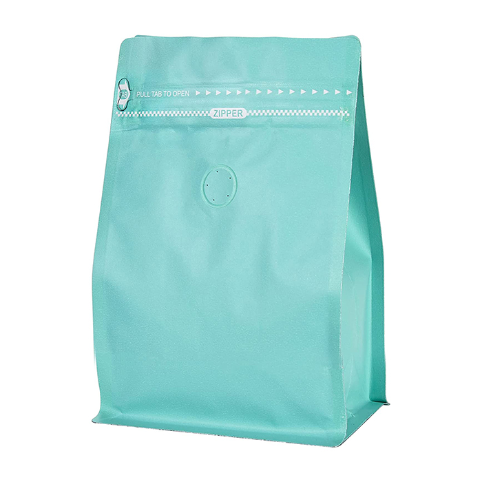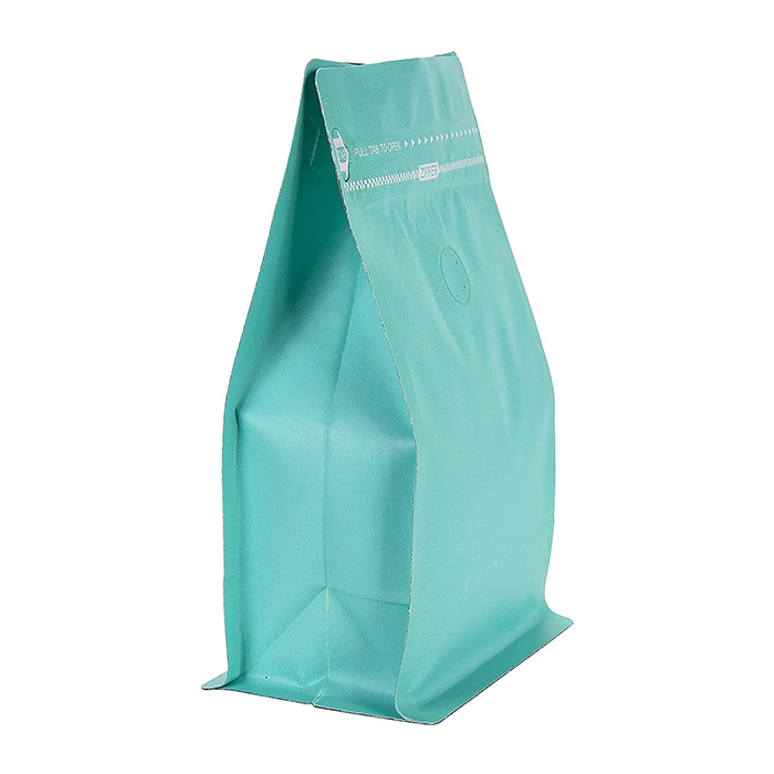 Blå flatbunn matt aluminiumsfolie glidelås kaffepose med ventil kalles også Square Bottom Bag eller Block Bottom Bag, Det er en motepose for kaffeemballasje. Forbedret rivebestandighet og slagfasthet, lett å lagre og transportere.